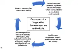 Mutual constitution is the notion that society and the individual have an influencing effect on one another. Because a society is composed of individuals, the behavior and actions of the individuals directly impact the society. In the same manner, society directly impacts the individual living within it. The values, morals, and ways of life a society exemplifies will have an immediate impact on the way an individual is shaped as a person. The atmosphere that a society provides for the individual is a determining factor for how an individual will develop. Furthermore, mutual constitution is a cyclical model in which the society and the individual both influence one another.[25]