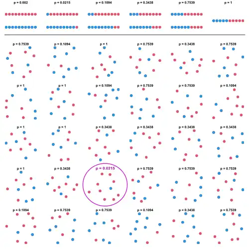 30 samples of 10 dots of random color (blue or red) are observed. On each sample, a two-tailed binomial test of the null hypothesis that blue and red are equally probable is performed. The first row shows the possible p-values as a function of the number of blue and red dots in the sample.