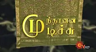 Mundhanai Mudichu is a 2010 Indian Tamil-language soap opera that aired on Sun TV.[1] The show premiered from 26 April 2010 to 4 April 2015 for 1,325 episodes. It aired Monday through Saturday at 6:00PM IST. The show starred Delhi Kumar, Shree Durga, Manoharan Krishnan, Rani and Hemalatha.