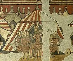 The final panel shows the ‘Royal Camp and the attack on the city of Majorca’. The camp is shown on the right hand side with the royal tent of yellow and red. James I is depicted in the foreground, represented in the centre of a group of knights. On James I's left stand three representatives, one of which has been identified as Nunó Sanç, count of Roselló. To the right hand side King Guilabert de Cruïlles is depicted, wearing a red helmet with a white cross and his hand resting on the knee of King James I. The bishop of Barcelona stands to the right of Guilabert shown wearing his mitre, and to his side the knight Ramon de Centells is found. The tent situated to the left of the King's, with the horizontal red stripes, is that of the Count of Empurias Hug V d’Empúries, who is found conversing with the Aragonese knight Pero Maça de Sangarrén. They are shown separated from the other group and the King this representation being true to the accounts which tell of the Count d’Empúries’ disagreement with King James I. The spaces between the two depicted tents and the figures of the composition were filled with the suggestion of other tents, creating the pictorial notion of a vast army camp. The assault on Medina Mayurqa is represented beneath the depiction of the royal tent. Here what could be described as a trebuchet is depicted and to its side a group of soldiers who are heading towards the city who find themselves clashing with a group of Saracens. A wall with towers surrounding a city full of houses, in the centre of which the castle of Almundaina can be seen, protected by a double wall.