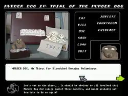 The player presents Murder Dog's case using a point-and-click interface to plead their case, present multiple items of evidence, call and cross-examine witnesses, and rest their case. Dialog is presented to the player through a dialog box, as well as a lower dialog box for commentary by the small dog. The dialog options in the game create branching depending on the evidence that is submitted, although it is up to the player as to whether to indict or attempt to exculpate Murder Dog for his crimes. For instance, Murder Dog can eat the evidence presented, destroy witnesses, and attempt to refute the evidence and witness testimonies presented, as well as attempting to murder the jury.
