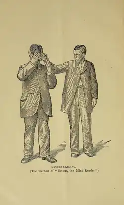 Muscle reading, also known as "Hellstromism", "Cumberlandism" or "contact mind reading", is a technique used by mentalists to determine the thoughts or knowledge of a subject, the effect of which tends to be perceived as a form of mind reading. The performer can determine many things about the mental state of a subject by observing subtle, involuntary responses to speech or any other stimuli.[1][2] It is closely related to the ideomotor effect, whereby subtle movements made without conscious awareness reflect a physical movement, action or direction which the subject is thinking about. The term "muscle reading" was coined in the 1870s by American neurologist George M. Beard to describe the actions of mentalist J. Randall Brown, an early proponent of the art.[3][4]