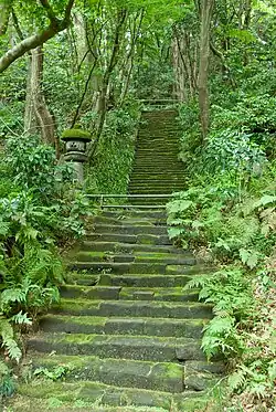 The Niō gate behind them leads to the 50-step mossy stairway which today is the temple's main claim to fame, and which has gained it the above-mentioned nickname "Kokedera". At the bottom of the stairs are two caves, of which one hosts a statue of Nichiren, while the other is a mausoleum to many of the priests that have lived here.[4] Above the mossy stairs there is a third building called Hokkedō, or Hall of Scriptures.[4]