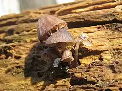 Mycena is a genus of saprotrophic mushroom. The name "Mycena" comes from the Ancient Greek μύκης, or mykes, meaning "mushroom."[3] It is characterized by a white/grey spore print, small conical (bell-shaped) cap, and very thin stem. Species found in the genus Mycena are typically known as bonnets.[4]