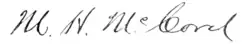 In 1896, McCord served as Maricopa County Republican Chairman. This led to his becoming a delegate to the 1896 Republican National Convention where he was a William McKinley supporter.[11] The day that McKinley was inaugurated President of the United States, McCord wrote to his old friend requesting appointment as Governor of Arizona Territory.[15] President McKinley forwarded his nomination to the United States Senate on May 19, 1897.[16] Supporters of McCord's appointment included Albert C. Baker, Lewis Wolfley, Webster Street, and Joseph Kibbey.[15] Additionally, both the Livestock Board of Arizona and the Arizona Agricultural Association endorsed McCord to become governor.[13] Opposition to the nomination was quite vocal however. Buckey O'Neill claimed the McCord had personally profited from his actions as a member of the Board of Control.[15] John Frank Wilson meanwhile went to Washington, D.C., to lobby against the nomination.[17] Attacks on McCord escalated to the point that he filed a libel suit against a newspaper in New York City.[18] Despite the opposition, McCord was confirmed by a vote of 29 to 18.[15]