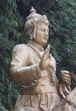 Lakshmisa, a superb story-teller, a dramatist and a Vaishnava by faith, is one of the most well-known writers of kavyas (narrative poems). Kannada scholar H.S. Shiva Prakash opines he lived in the mid-16th century, but R. Narasimhacharya and historian Nilakanta Sastri claim he was active in the late 17th century, probably during the rule of King Chikka Devaraja.[90][91] His Jaimini Bharata, written in shatpadi metre, is the poet's Kannada version of the Hindu epic Mahabharata and is one of the most popular poems of the late medieval age.[92] A collection of stories, the epic poem contains the famous tale of the Sita Parityaga ("Repudiation of Sita"). The author has succeeded in converting a religious story into a very human tale, making it popular even in modern times. For his deft usage of the language, the poet earned the honorific Upamalola (lit. "One of revels in similes and metaphors").[32]