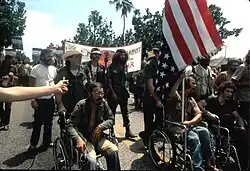 He also points out that during the Vietnam War years there were several newspaper accounts of pro-war demonstrators spitting on anti-war demonstrators, and suggests that these oral accounts could easily have been reinterpreted and inverted and made into stories about activists spitting on veterans.[13] Perhaps one of the most well known of these spitting incidents was directed at antiwar activist and ex-Marine, Ron Kovic, who was wounded and paralyzed in the Vietnam War. At the 1972 Republican National Convention he and two other wounded vets shouted "Stop the bombing!" as Nixon accepted the nomination for president, and were promptly spat on by a man wearing a Four More Years button.[14]
