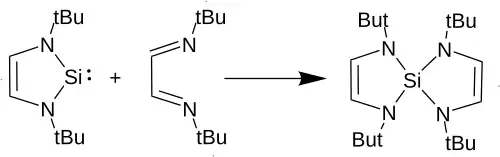 Dienes, as well as heterodienes including benzil or the common NHSi backbone N,N'-diterbutyl-1,4diazabutadiene ([tBuN-CH=CH-tBuN]) react in a [4+1] fashion to yield molecules with two five-membered rings sharing a single silicon atom.[2][4]