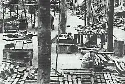 Road and bridge repair methods. There were several ways to keep traffic moving amid the destruction wrought by the bombers. Simple pontoon bridges were made of lashed together bundles of bamboo, topped by heavy wooden planking. Sturdier pontoon structures were made by tying wooden canal boats together – with camouflage measures to hide them during the day from aerial observation. Bridges were also built underwater to escape detection. As noted above, supplies, equipment and material was pre-stocked along roads, and near various choke points like ferry crossings so that repairs could be made quickly. Delayed action bombs caused special problems. Designated personnel were tasked with dismantling them, or watchmen kept them under observation- signaling all within blast distance to disperse when the bombs showed signs of detonating. Repairs were often done at night when the enemy aircraft would be less active.[34]