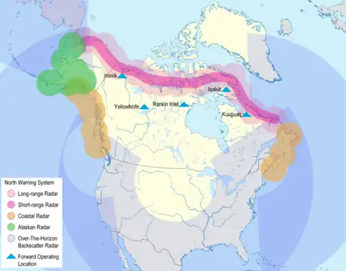 In 1989, NORAD operations expanded to cover counter-drug operations, for example, tracking of small aircraft entering and operating within the United States and Canada.[34] DEW line sites were replaced between 1986 and 1995 by the North Warning System. The Cheyenne Mountain site was upgraded, but none of the proposed OTH-B radars are currently in operation.