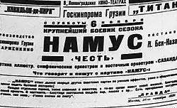 Namus was first premiered in Yerevan's Nairi Theatre on 13 April 1926.[11] On 3 October of the same year, the film was presented in Moscow.[12] A poster in Leningrad in 1926 called Namus the "biggest blockbuster of the season".[13] When asked about the film, Hamo Beknazarian said "I wanted to set the power of custom in the pillory, that stupid force of the concept of 'father's honor'".[11] The film had incredible success and brought Beknazarian to fame in the Soviet Union, which helped him in his later works, making him the founder of Armenian cinematography.[7]