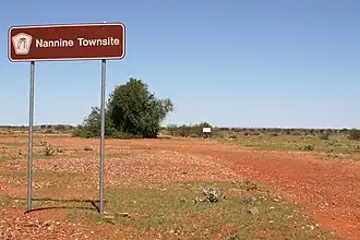 Nannine is an Aboriginal name, "Nannine Wells" being first recorded by a surveyor in 1889. The meaning of the name is 'fat', used of a place in the indigenous landscape where the primordial Dingo of the dreaming bit off part of an Emu, leaving a trace of the act in a local cliff-face, which the Aboriginal people called 'nganiny'.[5] The earliest days of gold discovery at this site are shrouded in controversy, but according to one source it is likely that the first suspicions of gold in the area were apparently held by Ingpen and Watts, station hands on the Annean pastoral station. In about May 1890 they showed the site to J. F. Connolly, a New South Wales mining engineer, who found gold but he does not appear to have been too impressed. In October 1890 McPherson and Peterkin were directed to the same site and found significant quantities of gold. By August 1891 they and others had recovered about 53 kilograms (1,700 ozt) of gold. The Murchison Goldfield, which included Nannine was proclaimed in September 1891. By December about seven hundred men were at the field.[6]