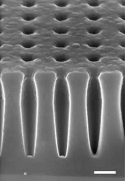 Angled cross-sectional scanning electron micrograph of a nanohole array etched in amorphous silicon, with a thin conductive polymer coating. Scale bar is 200 nm.