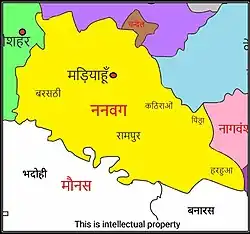 The Nandwaks/Nanwag Rajputs are a branch of the Kachwaha Rajput in what is now the Indian state of Uttar Pradesh. In the 16th century, founder of nanwag dynasty shree Naun Rao ji and his descendants seized mariahun tahasil and ruled there for many years after.[1] The villages of Kathiraon, Newarhia (having fort of Nanwag chieftain, Zamindar Sangram Singh)[2] lying at 25" 31' N longitude and 82" 80' E latitude (tahsil Mariahu)[2] and Barsathi, latitude 25" 34' N and longitude 82" 91' E in Mariahu tehsil,[3] were administered by the Nanwag Rajputs from the 16th century to the later part of the 19th century.[4] The whole of Mariahu tehsil was administered by them during the medieval period and the tehsil got its name from Mandav Dev, the presiding deity of Nanwags.[5] currently they are spread in Prayagraj, Azamgarh, Mirzapur and Varanasi district. In census report of 1865,population of Nanwag rajput was approximate 24,000.