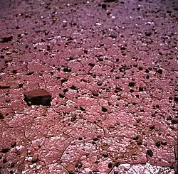 The main feature of the area is a set of about 1,000 petroglyphs, distributed among the rock outcrops to the south and south-east of the claypan. Most of the petroglyphs are non-representational, consisting of circles, lines and other geometric motifs, though there are some examples of animal tracks. The motifs have been compared with those found elsewhere in Central Australia and Tasmania.[5][6]