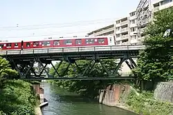 Abandoned abutments of a bridge on the former route of the Nara Line are under the bridge of the Kintetsu Kyoto Line.