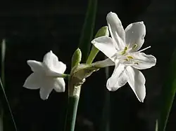 The "triandrus" form is seen in only two species, N. albimarginatus (a Moroccan endemic) and N. triandrus. It combines features of both the "daffodil" and "paperwhite" forms, with a well-developed, long, narrow tube and an extended bell-shaped corona of almost equal length. The flowers are pendent.[17]