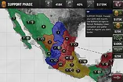 NarcoGuerra is a turn-based strategy game with Risk like elements that takes place over a map of Mexico.[2] The map is divided into a number of regions, most consisting of a single state, which are either controlled by the police or one of the cartels. Each region has a number of units stationed in it, the more units the easier it is to hold, and attack from. Some regions also bestow bonuses when held such as increased income or defense. Each turn is split between two main phases, the Support Phase and Attack Phase. The player wins when they have removed all other opponents from the game. The game is lost if they lose all their regions to the opposing sides. There are 3 different game modes; Story, Skirmish and Local Multiplayer. Skirmish mode is unlocked once the player has completed Story mode.