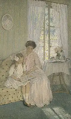 In spite of these formal and decorative intentions, the painting is one in which "the artist illustrated the elegance of the Belle Époque and the sunny pastimes of the bourgeoisie".[11] Fox frequently painted women reading in both indoor and outdoor settings,[12] another example is A Love Story (1903) in the Ballarat Fine Art Gallery which shows an elegantly dressed young lady reading a novel while lying in a hammock in the shade of a tree on a summer's day.[13] In paintings of the time, women reading were often placed in an outdoor setting where gardens, foliage and the effects of the light were part of the subject matter. Claude Monet, for example, painted Springtime in 1872. Fox's The Lesson (1912) in the National Gallery of Victoria Melbourne,[14] shows a woman and girl reading in an indoor, domestic setting.