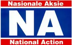 National Action (more commonly known by its Afrikaans name, Nasionale Aksie) was a short-lived South African political party formed in December 2001 by the Afrikaner Eenheidsbeweging's (AEB) Cassie Aucamp and former National Party minister Danie Schutte.[1][2] Aucump retained dual membership of the parties before leaving the Afrikaner Eenheidsbeweging (AEB) in the 2003 floor-crossing window. The AEB, along with other Afrikaner parties, was merging into the Freedom Front Plus to contest the 2004 elections but the National Action, claiming to support Afrikaner interests, remained separate, and competed in the 2004 elections. It won no seats in the National Assembly of South Africa or any of the provincial legislatures.[3] It did not contest the 2009 elections.