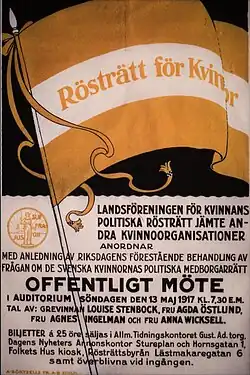 In 1905, the LKPR presented its demands to the liberal government of Karl Staaff, who answered them that women suffrage should be introduced as soon as full male suffrage, which had to come first.[5]