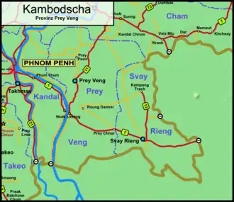 National Highway 1 or National Road No.1 (10001) is one of the national highways of Cambodia. With a length of 167.10 km (103.83 mi), it connects the capital of Phnom Penh, through Prey Veng Province, with Bavet, Svay Rieng Province on the border with Vietnam, and continues in Vietnam as the QL22 Highway to Ho Chi Minh City in the south east.[1] In Phnom Penh the road converges with National Highway 2 near Monivong Bridge and National Highway 5 at Stat Chas Circle Garden, near the French Embassy.[2]