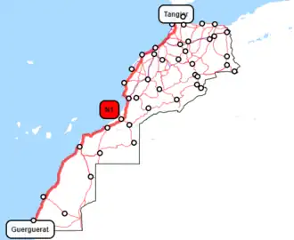 National Route 1 (N1) is a national highway of Morocco. It connects Guerguerat in the south near the border with Mauritania to Tangier on the northwest coast of Morocco.[1] It is an important highway running along the western Atlantic coast of the country. It passes through Rabat, Larache and other important cities and for a substantial part of the Rabat-Tangier leg runs parallel with the A1 Rabat–Tangier expressway. It is the longest national motorway in the country.