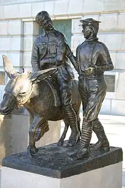 A bronze sculpture by Paul Walshe of Richard Alexander Henderson as The Man with the Donkey stands outside the National War Memorial. It is based on the photograph of Henderson taken at Gallipoli by James Gardiner Jackson on 12 May 1915, and is a "tribute to all medical personnel, stretcher bearers and ambulance drivers who served alongside New Zealand troops in wartime". Commissioned by the Royal New Zealand Returned and Services' Association with sponsorship from Oceanic Life,[45] it was unveiled by Henderson's son Ross on 20 April 1990.[6] An inscription reads: