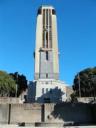Work on the carillon was completed in time for an Anzac Day 1932 dedication viewed by a crowd of 10,000 people.[6] Various dignitaries gave speeches, Governor-General Lord Bledisloe switched on the Lamp of Remembrance on top of the tower, and then the carillon played the national anthem and several hymns, accompanied by the singing of the crowd.[6] The Evening Post described the sound of the carillon as 'magic from the skies'.[11]