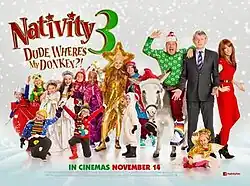 Nativity 3: Dude, Where's My Donkey?! is a 2014 British Christmas comedy film which serves as the third instalment of the Nativity film series and was directed by Debbie Isitt. It stars Martin Clunes, Marc Wootton, Catherine Tate with Celia Imrie and Jason Watkins. Like its predecessors, it was distributed by Entertainment One.