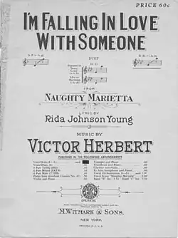 Selections from Naughty Marietta were already being released by Victor during its original Broadway run. In November and December 1910, "I'm Falling in Love with Someone" was covered by John Barnes Wells, Harry Macdonough and Evan Williams. Lucy Isabelle Marsh recorded "Italian Street Song".[25] By the summer of 1911, Victor Herbert's Orchestra was recording selections from the operetta and releasing medleys like "Gems from Naughty Marietta".[26] His 1911 recording of "The Dream Melody Intermezzo" (Blue Amberol Records #1775) is included in the National Recording Registry.[27]