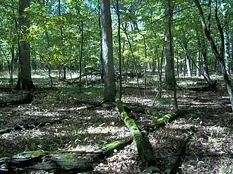 Busse Woods, the heart of the forest preserve, is a mature Great Lakes hardwood forest. A 440-acre (180 ha) segment of the woods, the Busse Forest Nature Preserve, is listed as a national natural landmark[2] as a surviving fragment of flatwoods, a type of damp-ground forest formerly typical of extremely level patches of ground in the Great Lakes region. Parcels of land with slow rates of precipitation runoff into adjacent wetlands and streams were likely to develop into flatwoods. A flatwoods forest is characterized by red maple, swamp white oak, and black ash trees. The black ash trees of Busse Woods are threatened by the emerald ash borer, which was reported in Illinois for the first time in 2006.[3]