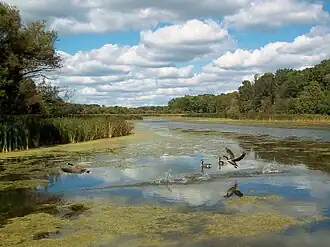There are 10.4 miles (17 km) of paved bicycle trail, the Busse Woods Trail, through the forest preserve: a 7.3-mile (12 km) loop and two spurs providing pedestrian and bicycle access to the preserve.[4] In contrast to the natural area, the northwest and southwest quadrants of the preserve are dominated by Busse Lake, a 590-acre (240 ha) artificial reservoir that serves as a flood-control catchment for Salt Creek that flows in from Rolling Meadows and by the tall skyscrapers of eastern Schaumburg.