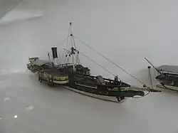 In 1832 the government tug service for the Waal was founded. It stretched from Rotterdam to Lobith.[47] The tug service was executed by NSM.[48] In 1833 the service was only profitable for NSM because Hercules had a fuel-efficient compound engine.[49] Tugboats used in the service were Hercules, Stad Arnhem and Stad Keulen.[50] In 1834 NSM built Simson.[32] In 1836 NSM made a contract with the Ministry for National Industry (Departement voor de Nationale Nijverheid) about towage upstream of Lobith. The provided loan for construction an iron tugboat led to the construction of the tugboat De Rhijn of 400 hp. For a time, the high price of British coal made that the tugs were fired with peat.[32] The tug service on the Rhine provided a very long term steady income to NSM. the government often subsidizing it by over 100,000 guilders a year. In 1841 the service upstream of Lobith was cancelled.