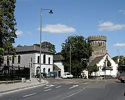 This Norman keep was built c. 1200 by Theobald Walter, 1st Baron Butler and completed by his son Theobald le Botiller c1220.[11] The circular keep is over thirty metres high, and its base has a diameter of sixteen metres. It is one of the finest of its kind in Ireland.[11] The crown of crenellations and ring of clerestory windows were added at the instigation of Bishop Michael Flannery in 1861. The intention was that the keep would become the Bell tower of a Pugin-designed cathedral that was never built.[11] The keep now features on the logos of a number of local clubs and businesses including Nenagh Town Council.[14] The castle and grounds were extensively renovated between 2009 and 2013. This project was aimed to position the castle as a key tourist attraction in the area. It is now open to the public.[15][16]