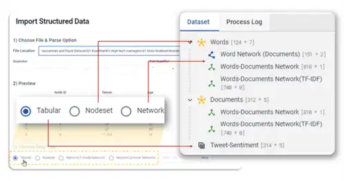 NetMiner 5 supports not only graph data composed of nodes and links, but also tabular and unstructured data without fixed schema or identifiers. This enables users to easily import a wide variety of raw and unstructured data suitable for machine learning applications. Within a single workspace, users can manage node sets, link sets, and structured/unstructured data simultaneously. Multiple graph layers under a node set can be organized in a tree structure, allowing for intuitive understanding of the data currently being analyzed.