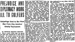 In the early 1920s, Speedy and her husband, Walter Speedy, played in Chicago-area tournaments, facing racial discrimination but persisting in their advocacy. She documented these experiences in her columns, often highlighting the obstacles that African American golfers faced.[11] In 1922, she wrote about how racial prejudice limited opportunities for African Americans in competitive golf. Despite these challenges, Speedy continued to promote the sport, eventually co-founding the Chicago Women’s Golf Club in 1937,[12] which became one of the leading Black women's social organizations in the city. In 1956, the club became a United States Golf Association (USGA) Member Club, allowing its members to compete in USGA tournaments.[13]