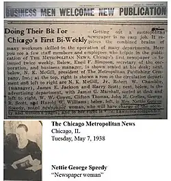 Speedy became a trailblazer in 1926 when she was honored at a banquet for the Chicago Press Club, where she was the only woman among other prominent journalists.[8] Her contributions to The Chicago Defender included a number of influential columns, such as "Scrapbook of Doers," which celebrated the accomplishments of African American women.[9] She continued writing for the newspaper for 14 years until she took temporary leave in 1927 due to health issues.[10]