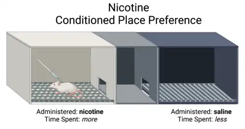 In a conditioned place preference study (CPP), researchers trained mice to associate nicotine administration with one chamber and saline administration in an adjacent chamber. At low doses of nicotine, alpha5 knockout mice and wildtype mice both showed preference for the nicotine chamber. However, at high doses of nicotine, only the α5 knockout mice preferred the nicotine chamber[13] demonstrating that the alpha5 knockout mice still experienced the rewarding aspects of nicotine, but not the normal aversive behaviors with nicotine overdose.