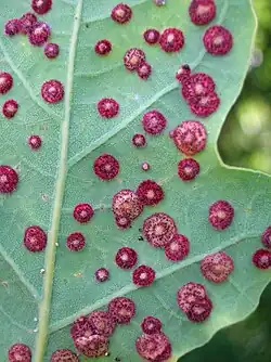 6. ^ J. S. Hough (1953). "Studies on the common spangle gall of oak. III. The importance of the stage in laminar extension of the host leaf". New Phytologist. 52 (3): 229–237. doi:10.1111/j.1469-8137.1953.tb07513.x. JSTOR 2429572.