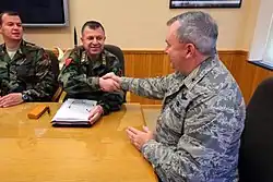 The New Jersey–Albania National Guard Partnership is one of 25 European partnerships that make up the U.S. European Command State Partnership Program and one of 88 worldwide partnerships that make-up the National Guard State Partnership Program.[2] The partnership was established in 1993. The current M2M focus places emphasis on OCO support, NCO Development, Military Medical pre/post deployment medical care, Military Police mentoring, military support to civil authority and disaster response.[3]