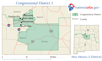 New Mexico's 1st congressional district of the United States House of Representatives serves the central area of New Mexico , including most of Bernalillo County , all of Torrance County , and parts of Sandoval , Santa Fe , and Valencia counties. It includes almost three-fourths of Albuquerque . The district has a notable Native American presence, encompassing several pueblos , including the Pueblo of Laguna and Sandia Pueblo , and the Tohajiilee Navajo Reservation outside Albuquerque.[ 4] The seat is currently represented by Democrat Melanie Stansbury . With a Cook Partisan Voting Index rating of D+7, it is the most Democratic district in New Mexico, a state with an all-Democratic congressional delegation.[ 5]