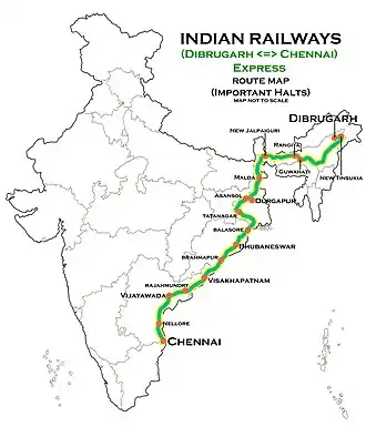 The train leaves New Tinsukia on every Sunday at 23:45 P.M. and arrives Tambaram on Wednesday at 21:15 P.M. traversing a distance of 3354 kilometres in 69 hours and 30 minutes.[3]