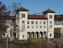The former New York, Westchester and Boston Railroad Administration Building at 180th Street and Morris Park Road in the Bronx houses offices of the New York City Transit Authority.