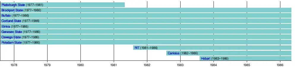 With the NCAA instituting a Division II Championship beginning with the 1977–78 season 8 upstate New York schools formed the NYCHA to have a better chance at securing one of the bids. So as to not lose those member schools, ECAC 2 began holding two separate conference tournaments the same year, (East and West), allowing those 6 teams to compete with other established division II schools for an NCAA bid. Plattsburgh State left the conference in 1981 and was replaced by RIT. The Conference added Canisius and Hobart over each of the succeeding two seasons but by 1986 the effort to keep the conference as a separate entity stopped and the NYCHA was dissolved.[2]