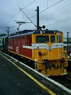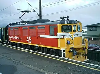 On 3 October 2007, the three Picton locomotives were transferred north to the Hutt Workshops where they were refurbished for use by Tranz Metro on Wellington Metlink suburban trains as a short-term solution to increase capacity before the arrival of the Matangi EMUs.[6] The locomotives were fitted with new radios, Translog event recorders, a single arm pantograph which replaced the two pantographs on each locomotive, and a signal trip which applied the brakes automatically if they passed a red signal (as used in the Wellington suburban area). The electrical and control systems were unchanged. Externally their colour scheme combined their older red livery with the new KiwiRail red and yellow livery, plus white whiskers on each yellow front end.[7]