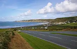 The beach is backed by a large pebble bank which was created by a major storm on 25 October 1859, and which acts as a sea defence or storm beach;[5][6] however, it is often breached, and rocks are washed onto the main road. In the January 2014 storms the sea washed the pebble wall across the road and a large wave washed the early evening Richards Bros bus into the adjoining field.[7] Newgale is popular with holiday makers, windsurfers, surfers and canoeists throughout the summer months.