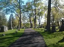 The Newton Cemetery Company was incorporated on 22 March 1860 by an act of the New Jersey state legislature.[3] It named seven men as "corporators", including Michael B. Titman, Moses W. Northrup, attorney Daniel S. Anderson, Samuel Cassady, the Reverend Nathaniel Pettit (of Christ Church, Newton), Thomas N. McCarter, and Whitfield S. Johnson. By 1866, the corporators had raised funds—approximately $16,000—to purchase a 26 acres (11 ha) tract of land from the heirs of Aaron Peck and open for burials. According to James P. Snell, the first interment was for Joseph A. Linn, who was buried in August 1867.[3] Five years later, in 1872, a local newspaper reported that "the number of interments is about 340--a large majority of which were re-interments from other places".[2]