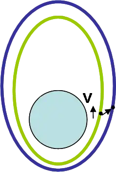 A local coordinate system for a space craft co-moving with one of the particles can again be defined. The -direction, toward the ceiling, is in the direction of . The -direction, toward the front of the craft, is perpendicular to but still in the plane of the trajectory. Unlike in a circular orbit, this craft no longer necessarily points in the direction of the velocity. The -direction is toward the left side of the craft.