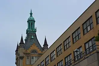 As soon as 1930, another addition was built to accommodate the rapidly growing student population. Architect Walter C. Martin, designed two additional three-story wings, that are stylistically similar but less ornate than the previous Snyder wings. The Martin wings are Clad with buff and beige brick and limestone detailing; one features stepped gables with ceramic tile designs.
